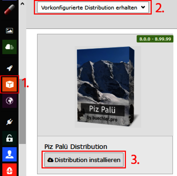 Gehen Sie dazu in die Verwaltungsoberfläche von TYPO3 und installieren Sie die Distribution Pizpalue. Dazu kann im linken Panel das Modul "Erweiterungen" ausgewählt werden.